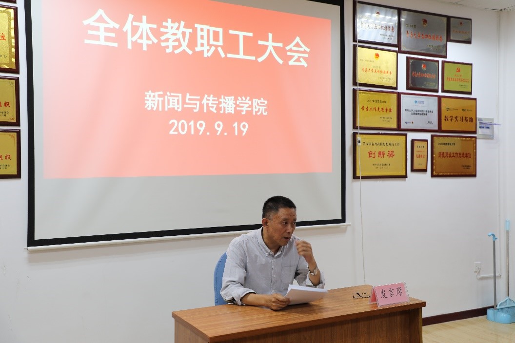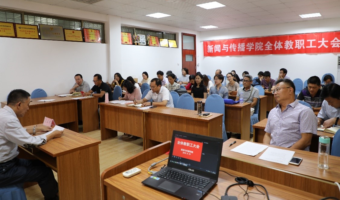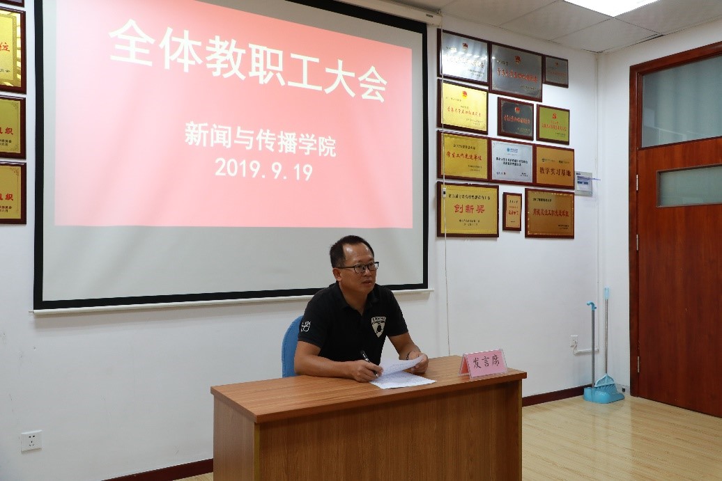 2019年9月19日,新闻与传播学院在博文楼312会议室召开全体教职工大会,学院40余名教职工参加会议,校领导邵彬出席会议并讲话。会议由学院党委副书记罗清辉主持。