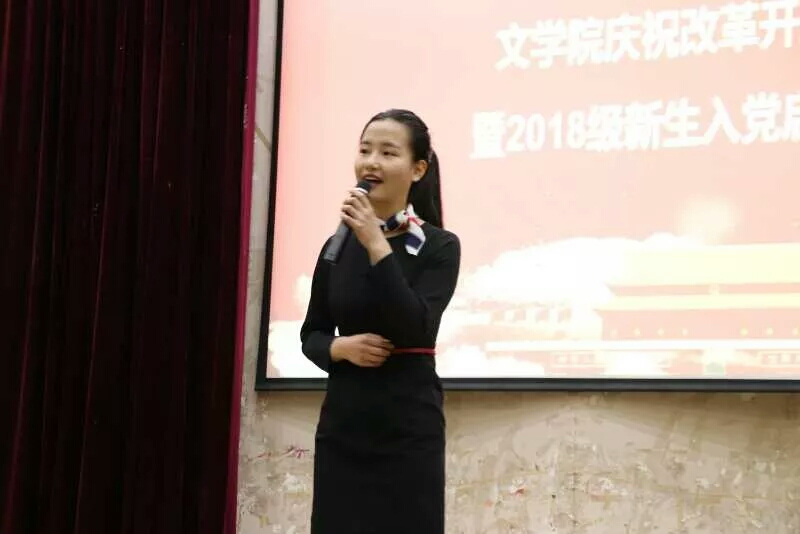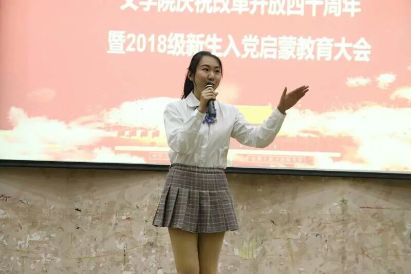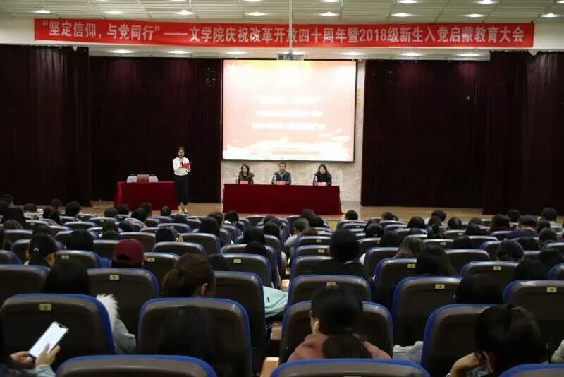 12月20日下午,“坚定信仰,与党同行” ——文学院庆祝改革开放四十周年暨2018级新生入党启蒙教育大会在金家岭校区图文中心四楼报告厅举行。文学院党委副书记张辉、团委书记曹珺、学生工作党支部书记李晨曦及2018级新生共同参会。