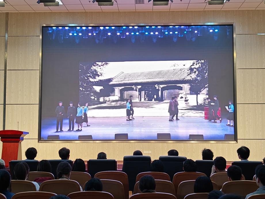 发挥专业力量、挺膺担当,经过十三稿的修改,最终呈现出高质量剧本。剧组面向全校选拔演员,来自十几个学院的近百位学生,克服疫情下的重重困难,在学校党委组织部、党委宣传部、团委、学生处、档案馆、后勤管理处、基建处、校医院等各部门的大力支持下,最终在2022年5月将话剧搬上了舞台,进行了一场没有观众的特别演出,同时进行了录制,留下了今天观看的视频版本。全体与会人员集体收看了话剧《沈福彭》的录像。