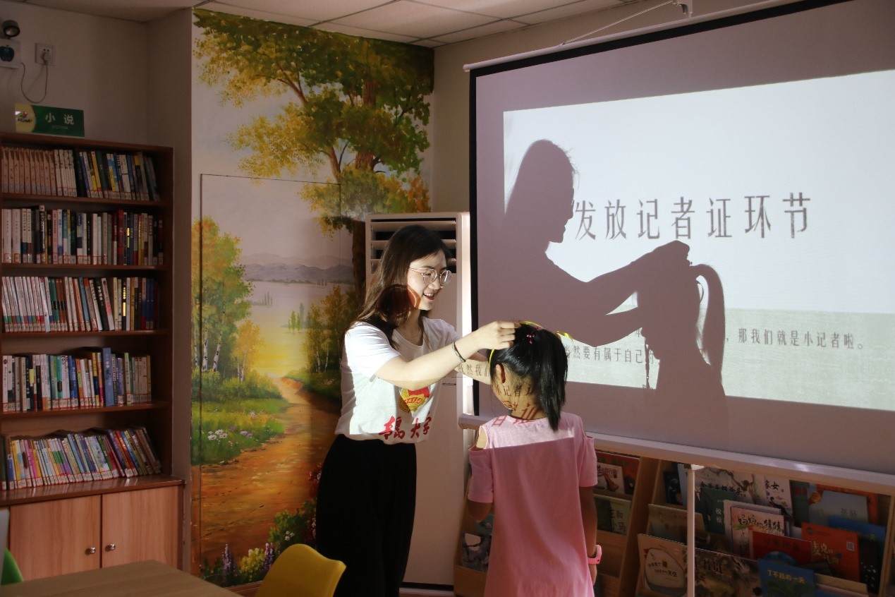 彼此熟悉之后,队员们完成了本次开营仪式的最后一个环节:由李倩同学为每位孩子佩戴上了事先准备的小记者证,让孩子们了解身为“小记者”的责任感——今后几天内无论是做采访还是写报道都要对自己的记者证负责。