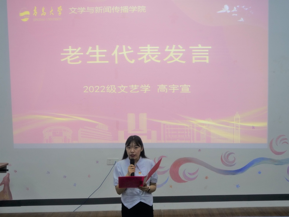 而后,由2022级文艺学专业高宇宣同学作为老生代表发言和2023级中国现当代文学专业研究生王佳昕作为新生代表发言。