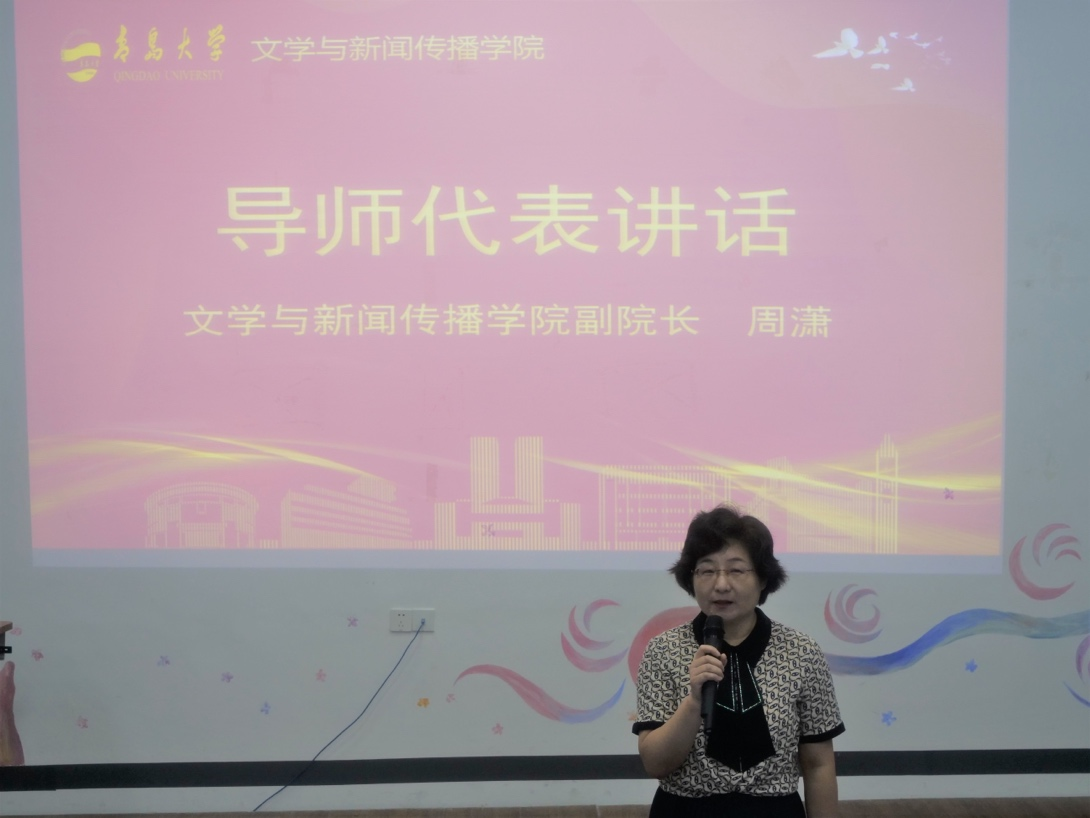 接着由副院长周潇作为导师代表讲话。周潇老师用温柔有力的声音,向新生提出自己的建议,在保证身心健康的情况下,把学业放在首位;学会获取文献资料;注意学习科研方法、提升自己的科研思维和科研能力。最后,周老师表示,如切如磋,如琢如磨,做学问是一个慢功夫。同时,祝愿同学们得偿所愿,不负韶华。