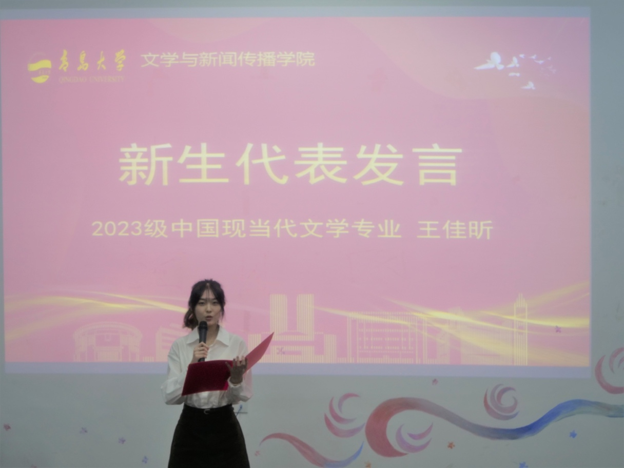 王佳昕同学首先表达了很荣幸能作为一名青大人。回首过去,展望未来。2023级新生研究生,作为追梦人和圆梦人,在未来三年的研究生生涯中,热爱生活,将青春与汗水挥洒,让自己的梦想绽放在青大。