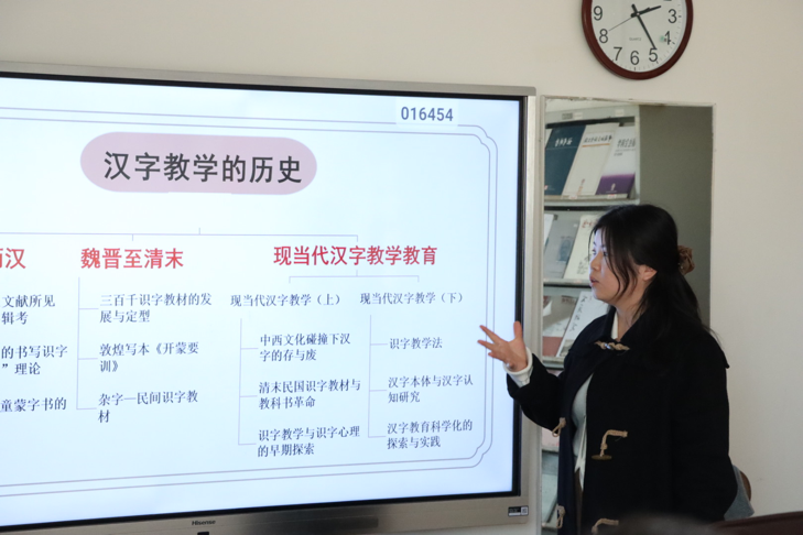 祝天瑞以自己的博士论文为基础,讲解了汉字教学的历史、汉字教学的现状、汉字教学的未来展望三个主要部分。在汉字教学历史方面从先秦两汉、魏晋至清末、现当代三个阶段进行具体分析。其基于3500常用字表对汉字教学现状进行了一个定量和描写,同时在多维视野下关注当代汉字教学。“从汉字研究到汉字教学角度来看二者的关系极为密切,我们要关注汉字研究对汉字教学的理论指导意义。同时,汉字教学为汉字研究提供了新的研究课题,重视二者之间的双重互动。”在最后她对于未来识字教学提出了初步设想,未来汉字课的改革要基于重视汉字研究和汉字教学的理论支撑和三维一体的培养目标这两个前提。教学需要整体的设计与安排,对教学方法、教学安排、课程安排方式、教师培养进行了设计。