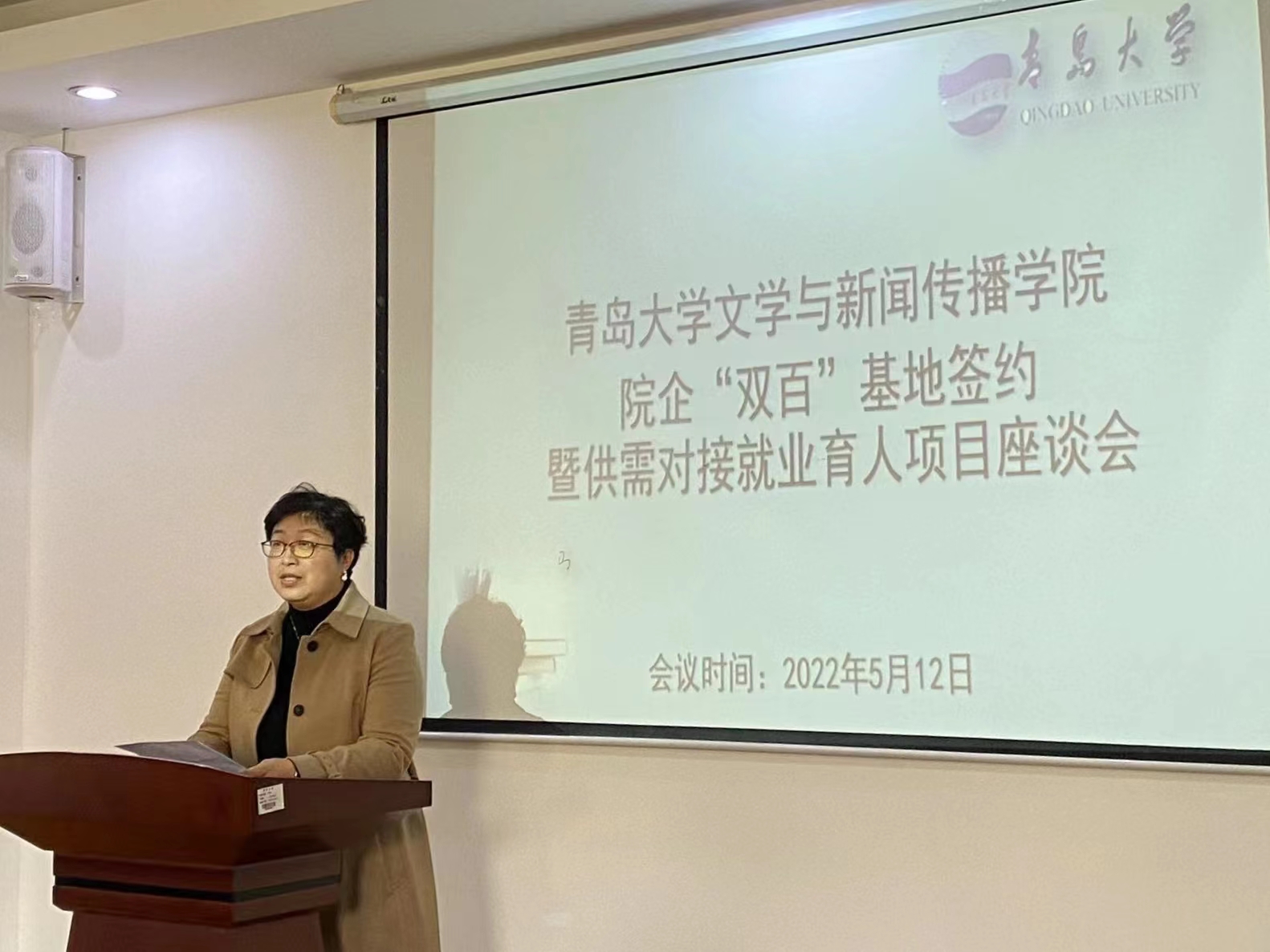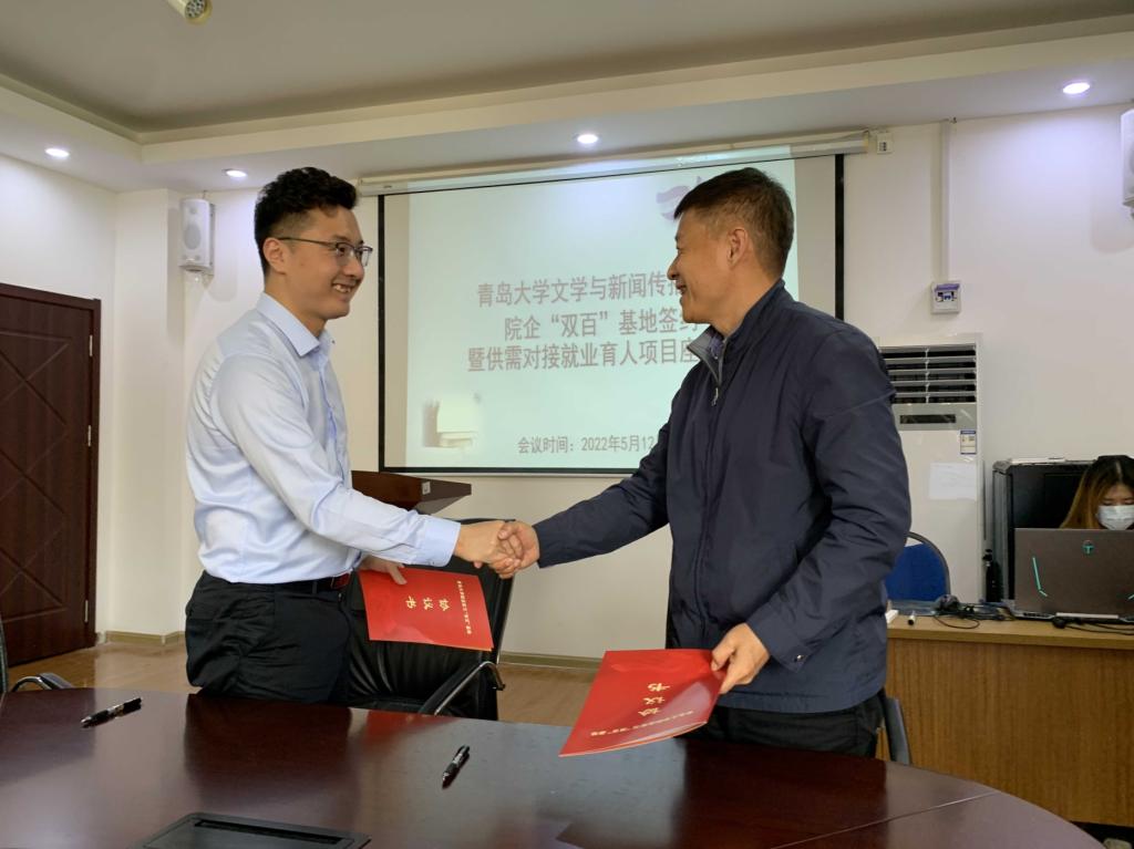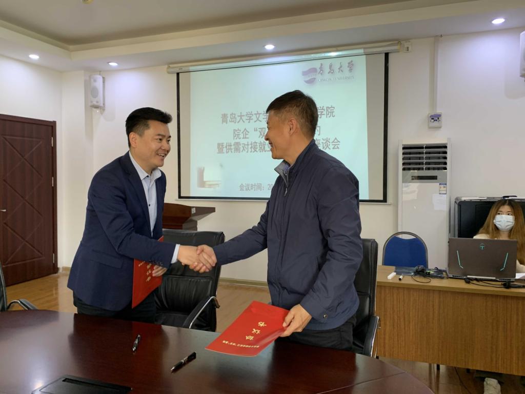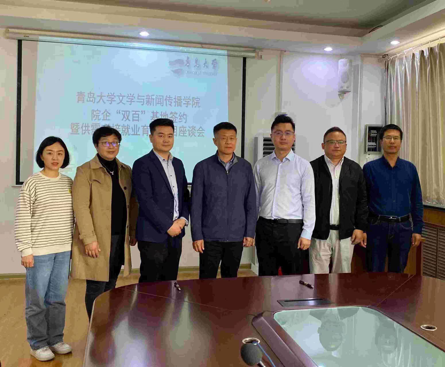 院企“双百”基地签约暨供需对接就业育人项目座谈会在博文521会议室举行。院党委书记张辉、中文系主任王汝良、语文教育系副主任张晓明、青岛康大控股有限公司人力经理刘大海、鲁南制药集团有限公司招聘经理杨浩,辅导员以及毕业生代表参加了此次会议。会议由院党委副书记戚昕主持。