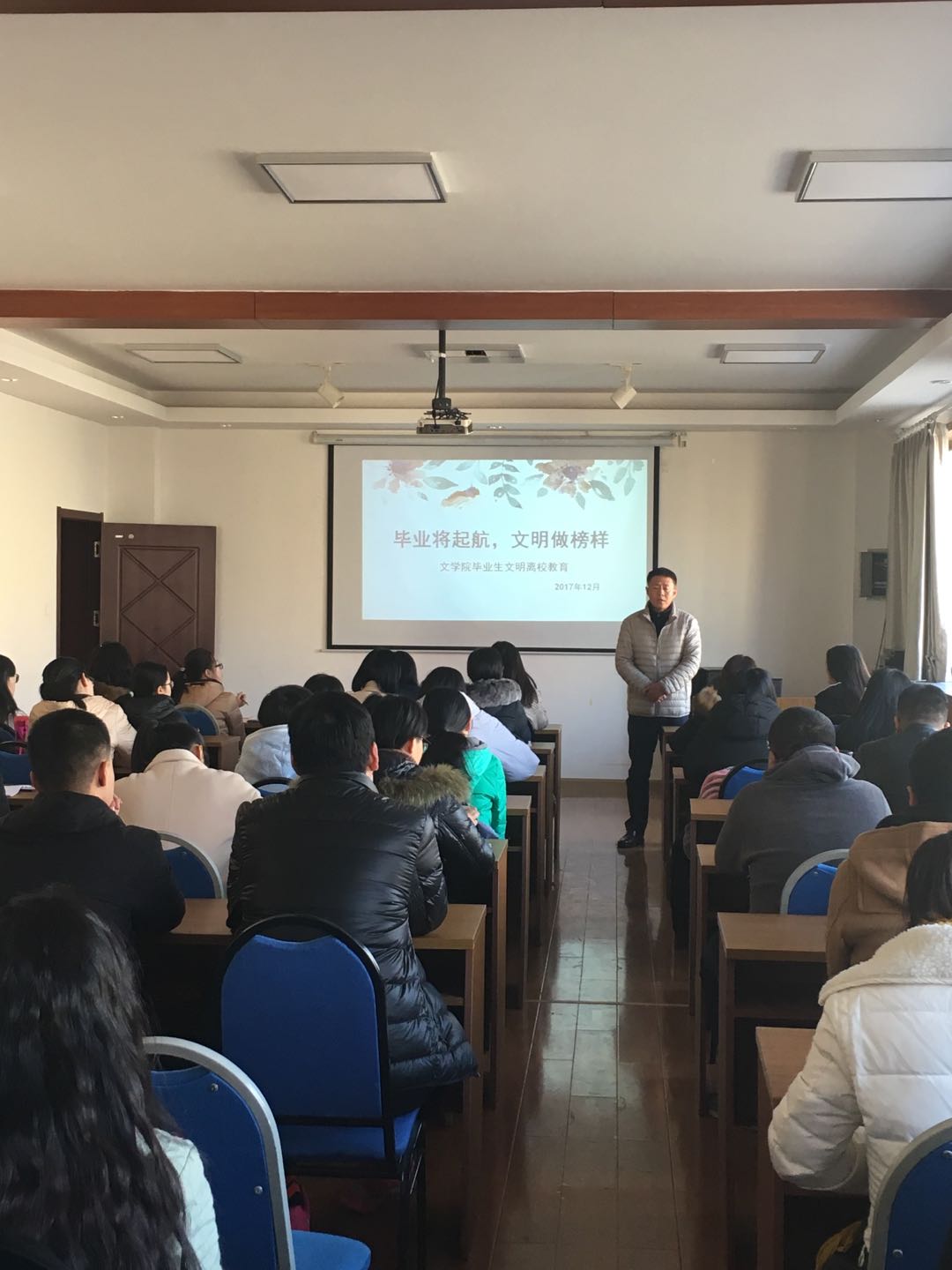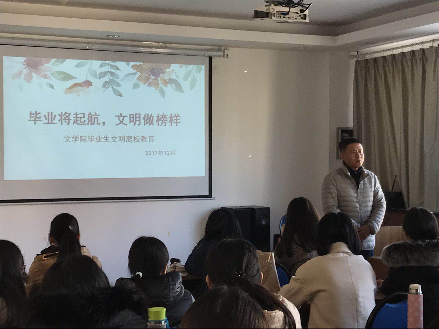 文学院于12月12日、13日、14日,在博文楼五楼会议室分三场召开“毕业将起航 文明做榜样”2018届毕业生会议。2018届非师范类毕业生共计200余人参会。会议由文学院团委书记曹珺老师主持,党委副书记张辉出席会议并做重要讲话。
