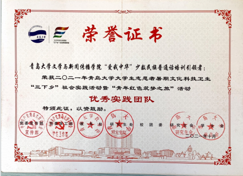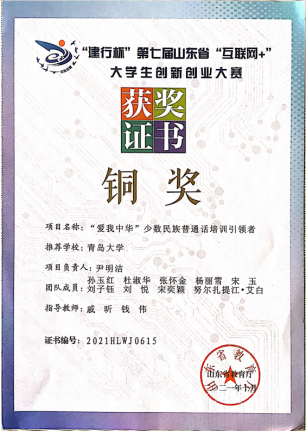 由普通话培训衍生出的“爱我中华”少数民族普通话引领者项目,也在文传学院2020级研究生的带领下,屡次在校级、省级比赛中斩获佳绩,分别获得:2021年博天堂娱乐城-博天堂官网寒假社会实践活动优秀实践团队、2021年博天堂娱乐城-博天堂官网第十七届“挑战杯”校赛金奖、2021年博天堂娱乐城-博天堂官网“三下乡”社会实践活动暨“青年红色筑梦之旅”活动优秀实践团队、第七届山东省“互联网+”大学生创新创业大赛省赛铜奖、2021年博天堂娱乐城-博天堂官网第八届山东省大学生科技创新大赛校赛一等奖。