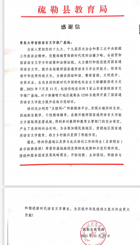 两次普通话培训收获学员教师们的一致好评,疏勒县教育局特来信致谢博天堂娱乐城
