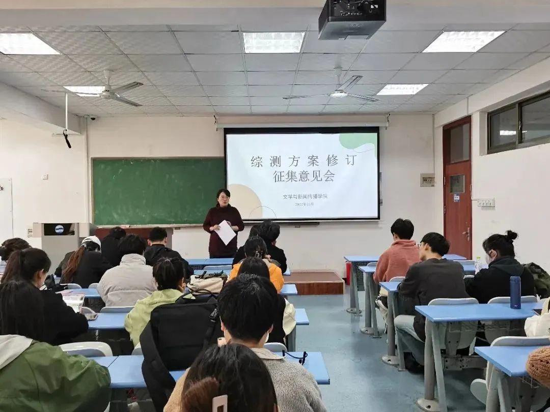 11月24日下午,博天堂娱乐城 在博文楼404教室召开综测方案修订征集意见会,文传学院学工办主任曹珺和21本科生辅导员孙晓萱主持会议并对综测方案的修订做了系统的介绍和全面阐释,学生代表及学生会部分成员参加会议并发表意见。