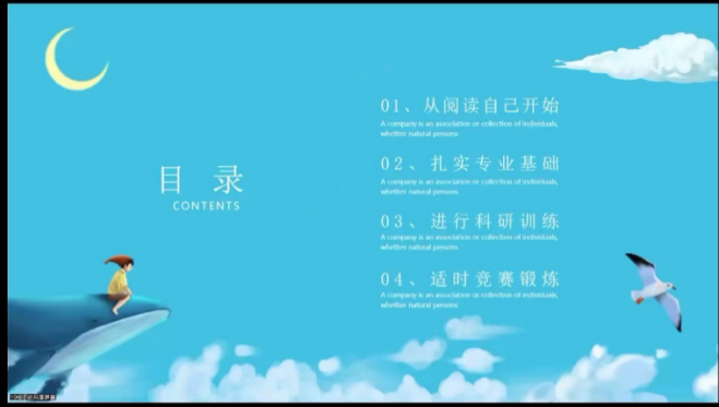 2019级编导专业、保研至中国传媒大学的杨菲在从阅读自己开始、扎实专业基础、进行科研训练、适时竞赛锻炼四个方面进行分享。在开始,杨菲指出对这个专业的热忱是非常重要的,并以中传的考核为例进行考研、保研的一些经验分享。杨菲强调“四维定位”,同学们应清楚地认识自己,同时提醒学弟学妹们多阅读、多积累、多看影视作品、注重视角思维培养。在竞赛中努力学习、多拍作品、多锻炼,从平凡中挖掘出伟大。