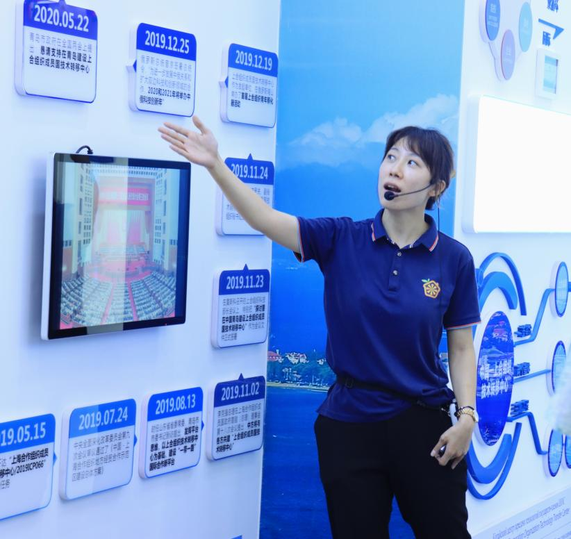 在中国—上合组织技术转移中心,现场解说员带领同学们参观了展厅的技术转移转化区、成果展示及文化交流区、创新服务配套区和生活配套区四大功能区,并详细解说了每个功能分区的布展内容。在展厅中心设有数字化展示平台,方便来访者一站式了解上合组织成员国的部门介绍,科研战略与计划、科研表现力评估等。