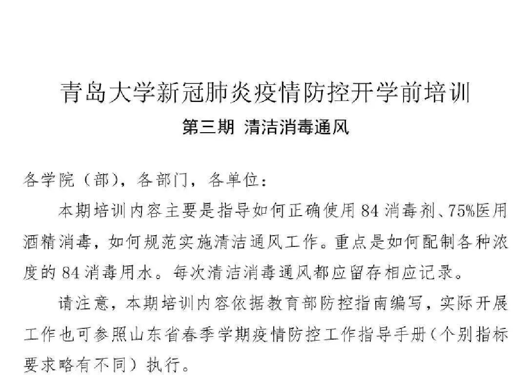 8、每个宿舍配备75%酒精、消毒液,宿舍每天至少两次通风消毒。在通风消毒期间,宿舍内禁止有人员逗留,学生们应及时调整作息。