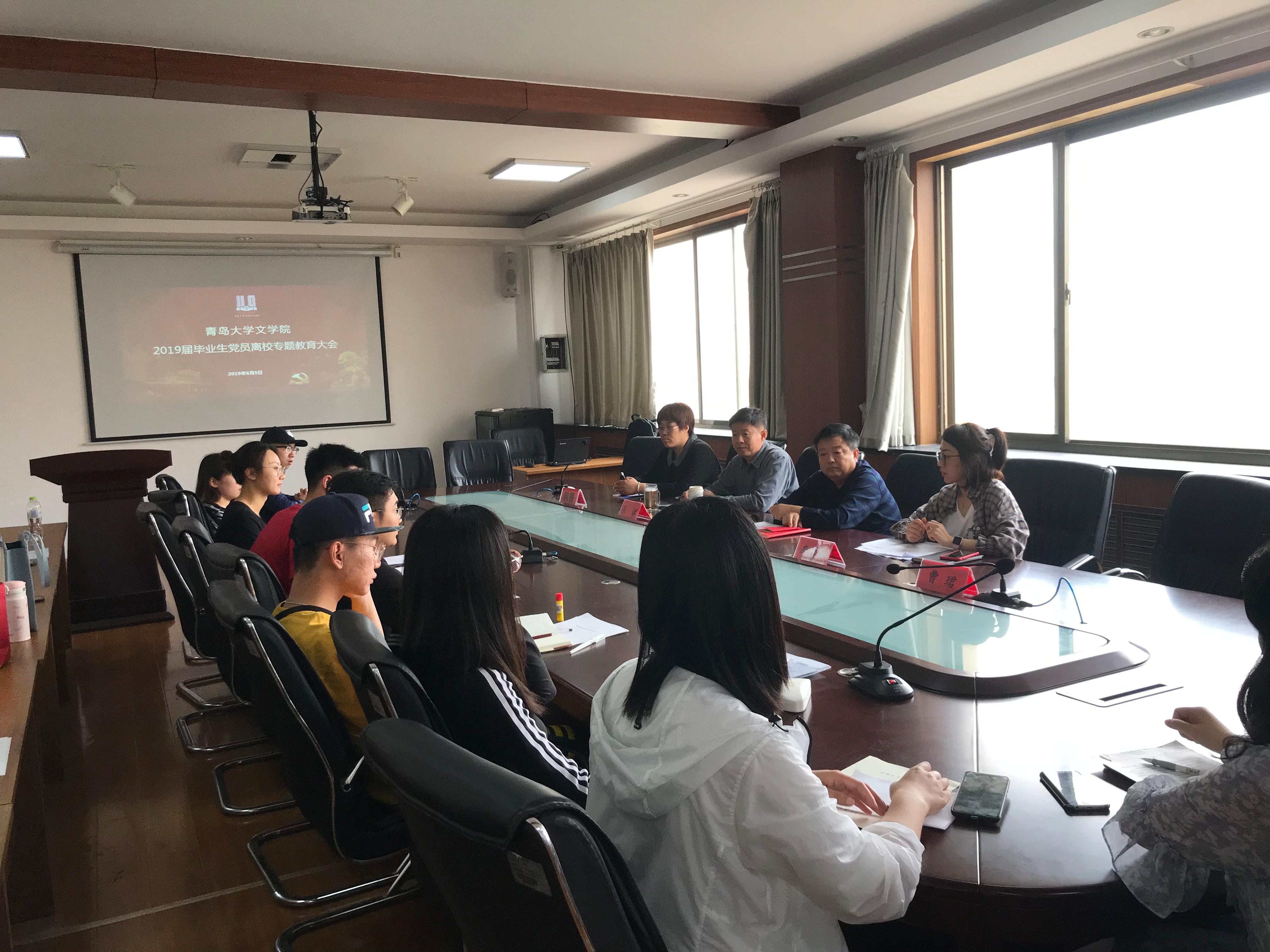 6月5日下午3时,文学院在博文楼会议室举行2019届毕业生党员离校专题教育大会。文学院党委书记杨立华、党委副书记张辉、学生党支部书记李晨曦、团委书记曹珺、学工办主任韩菁以级毕业生党员参加此次会议。