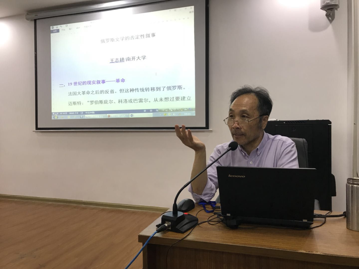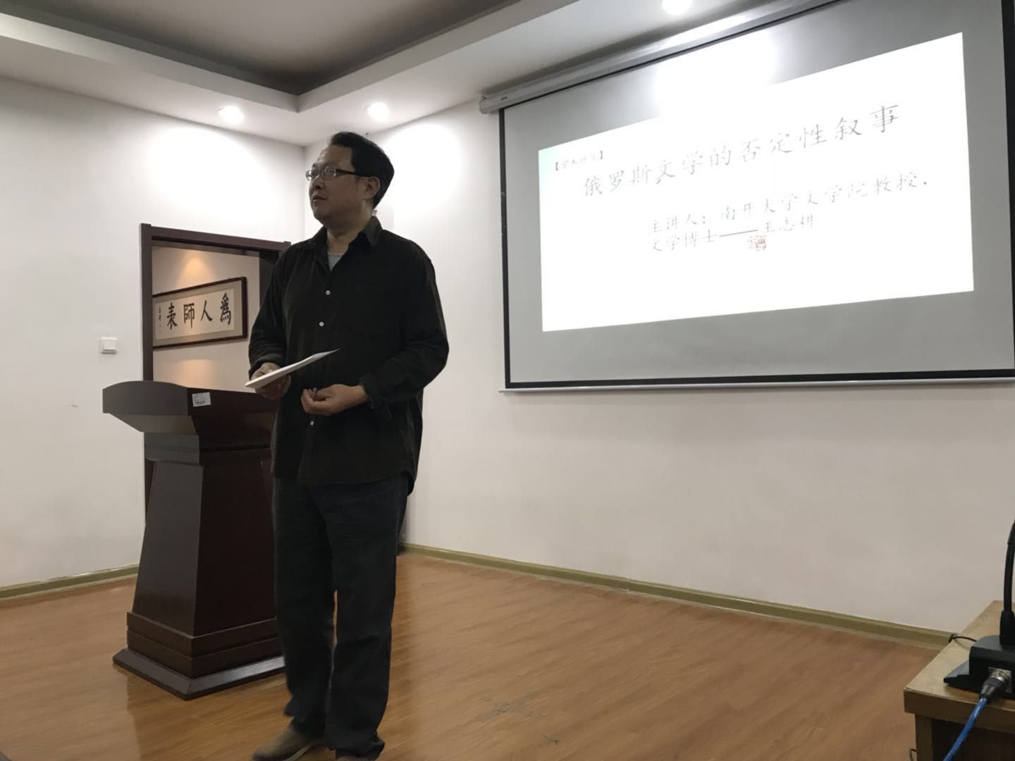 5月16日晚19:00,文学院博文讲堂2019年第10讲——《俄罗斯文学的否定性叙事》于我校浮山校区博文楼521会议室举行,主讲人为南开大学文学院教授、中国俄罗斯文学研究会副会长王志耕博士,讲座由文学院院长刘东方教授主持。文学院师生80余人参加了此次学术讲座。