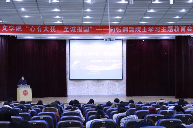 贯彻学校第三次党代会会议精神,文学院开展向张嗣瀛院士学习教育活动——12月13日下午,在金家岭校区图文四楼报告厅举行“心有大我,至诚报国”主题教育会。文学院团委书记曹珺老师主持本次会议,院学生会干部代表和2018级学生共300余人参会。