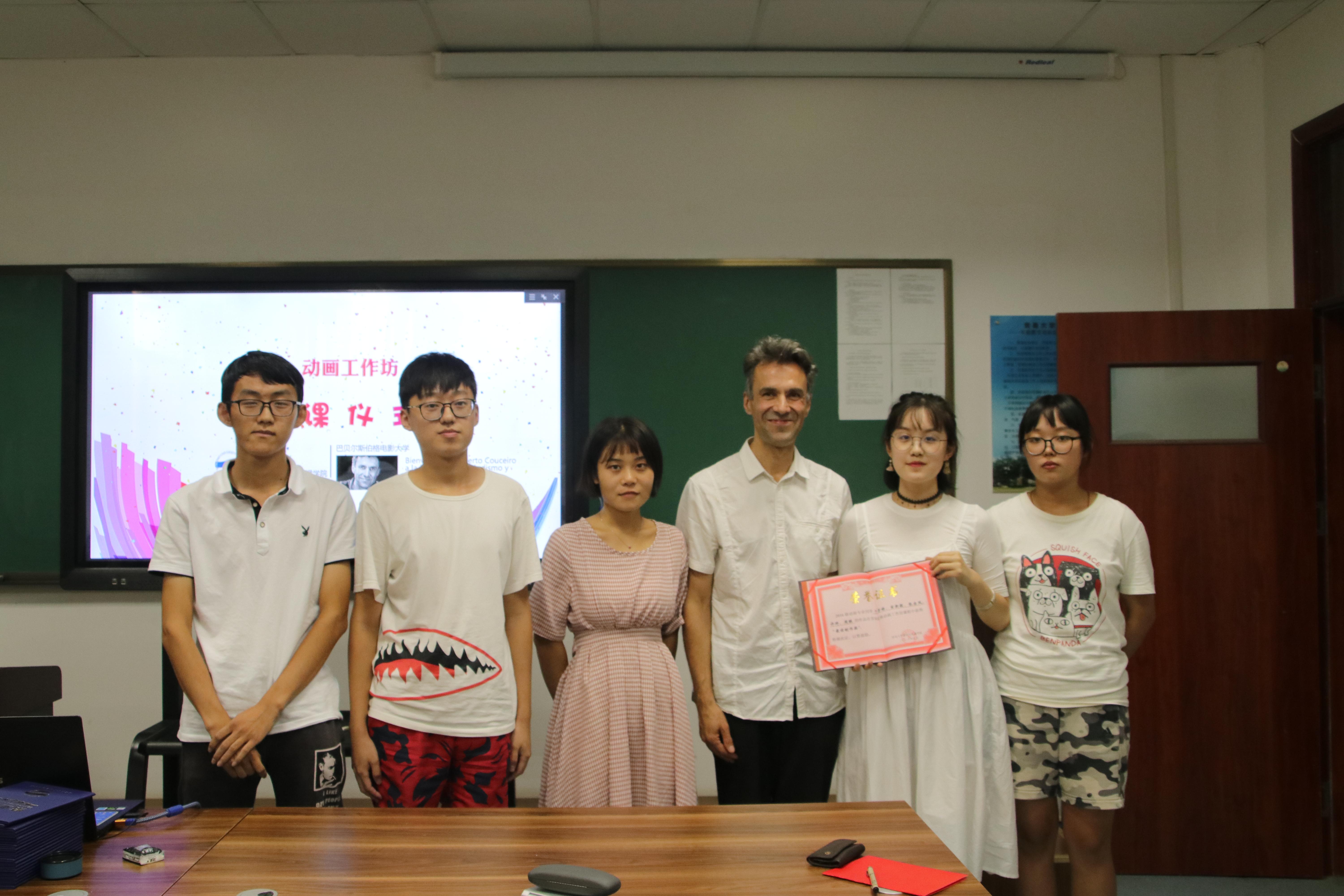 邱秉常副院长和Alberto老师一起为获得最佳创意奖、最佳合作奖、最佳制作奖、最佳剧情奖的四个小组颁奖,动画教研室的四名教师同学们颁发了结课证书,最后大家一起合影留念。