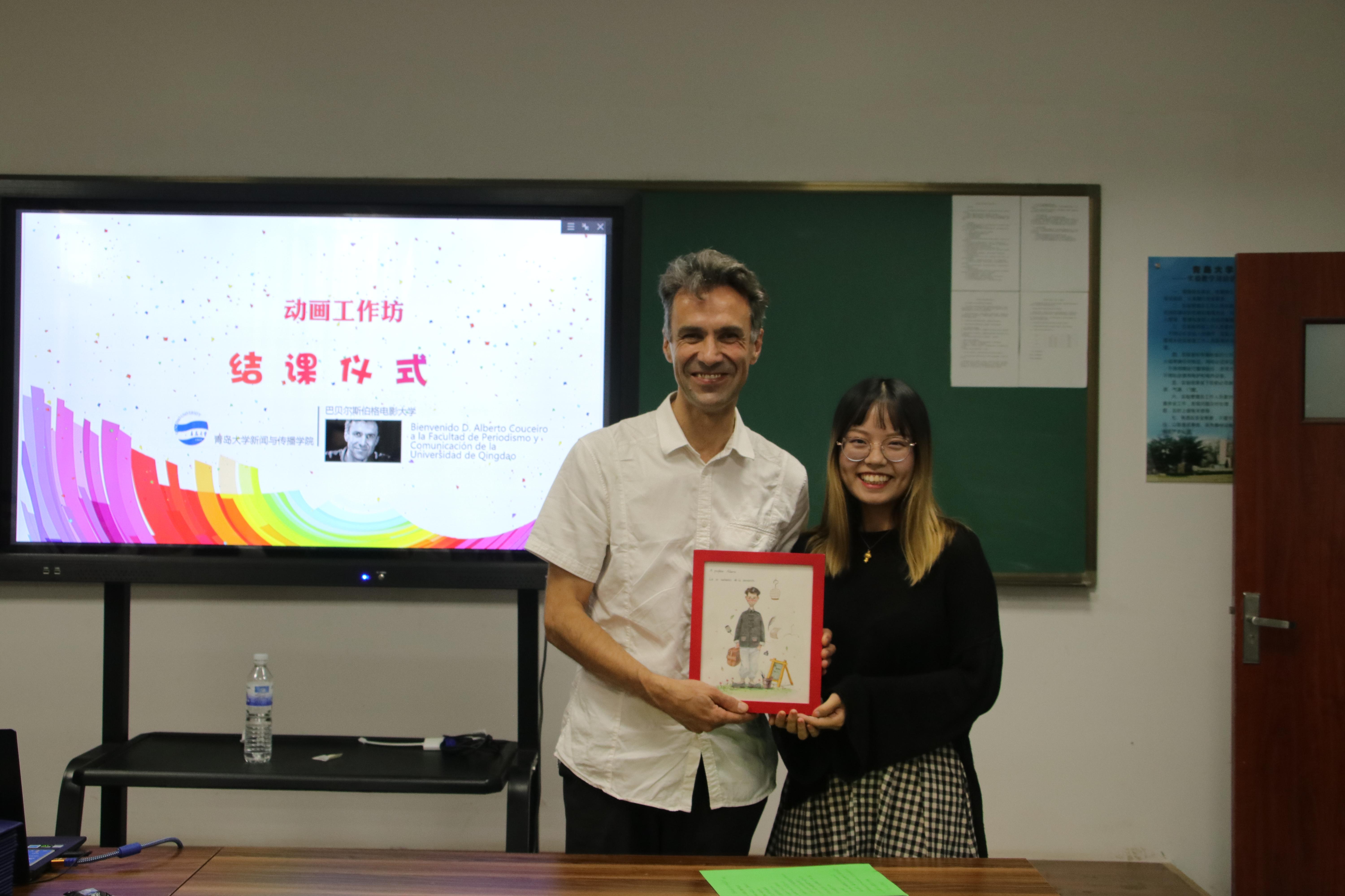 9月7日下午,本届定格动画工作坊举行了结课仪式,新闻与传播学院副院长邱秉常主持仪式,青岛电视台蓝海主任和动画教研室全体教师出席仪式。邱秉常首先代表学院向Alberto老师表示衷心的感谢,对本届动画工作坊的教学方式、取得的成效以及Alberto老师的严谨、敬业给予充分肯定。接着,大家一起观看了工作坊视频回顾和学生们的作品展映。邱秉常代表学院向Alberto老师赠送了礼物。2016级动画专业胡晨同学向Alberto老师和邓茜、颜朵两位承担翻译工作的外语学院西班牙语系大四学生,赠送了亲手为他们绘制的个人肖像。