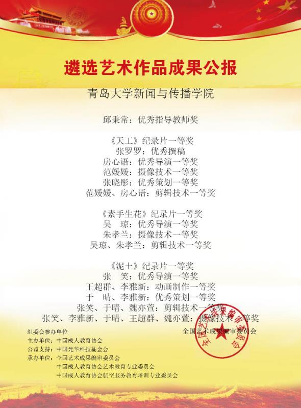 其中,张罗罗获得优秀撰稿奖;房心语、吴琼、张笑等3位同学获得优秀导演一等奖;范媛媛、朱孝兰、张笑、李雅新、于晴、王超群、魏亦萱等7位同学获摄像技术一等奖;张晓彤、于晴、李雅新等4位同学获得优秀策划一等奖;范媛媛、房心语、吴琼、朱孝兰、张笑、于晴、魏亦萱等7位同学获得剪辑技术一等奖;王超群、李雅新等2位同学获得动画制作一等奖。