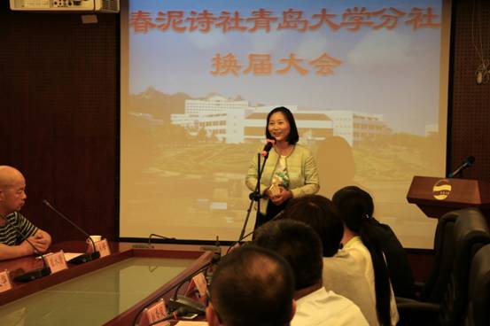 平度市文化广电新闻出版局局长刘成爱在会上讲话。他充分肯定了春泥诗社青大分社成立后开展的工作和取得的的成效,鼓励广大诗歌爱好者以高度的文化自信坚守诗歌阵地,弘扬中华民族的诗文精神,在喧嚣的的社会永远保持追寻诗和远方的情怀。