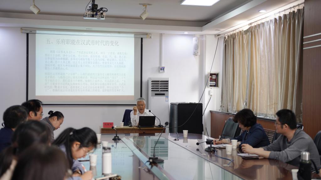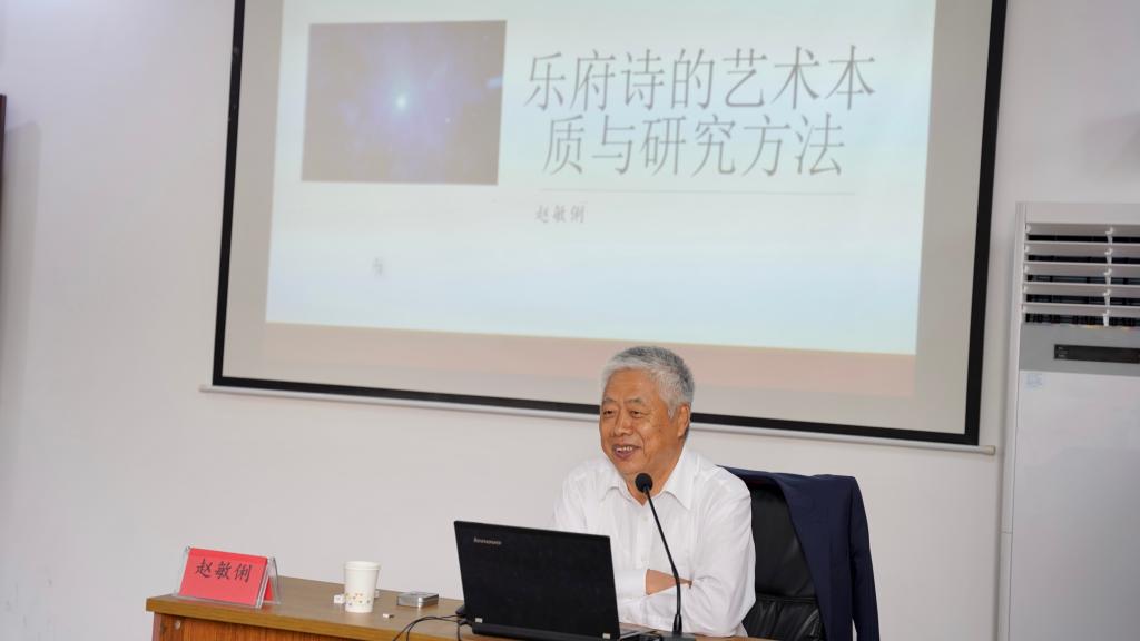 本次会议主题为《乐府诗的艺术本质与研究方法》,赵教授首先提出了一系列诸如“何谓乐府诗?乐府为什么要保存和演唱诗歌?这些诗歌又是从哪里来的?”等问题,引起同学们的思考。随后,赵教授向大家介绍了乐府的历史源头和乐府诗的定义,以及乐府的发展变化。之后,赵教授结合历史背景和生动案例讲解了乐府诗的范畴。赵教授认为乐府诗的主体是由历代国家乐管机构传承下来的乐歌,它是一种特殊的诗与乐相结合的艺术,有着独特的艺术本质,我们要先明确其艺术本质,然后再选择独特的研究方法。赵教授结合郭茂倩《乐府诗集》中的案例说明:首先要辨题材、别功能,将其与乐府之外的其他诗歌题材加以辨别;其次要明制度、通文化,要了解古代的制度文化;最后要晓音声、知乐章,要从音乐的角度进入,再分析文辞。由此才能真正了解独属于我们国家、我们民族的艺术瑰宝。