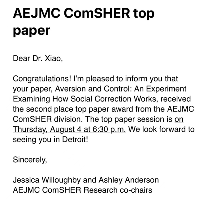 近日,博天堂娱乐城 教师肖喜珠获得新闻与大众传播教育协会(AEJMC)2022年最佳论文奖(Top Paper Awardees)二等奖。获奖论文的题目为《厌恶与控制:一个研究社会矫正如何运作的实验》(Aversion and Control:An Experiment Examining How Social Correction Works)。该研究基于实验考察了如何纠正新冠不实信息。