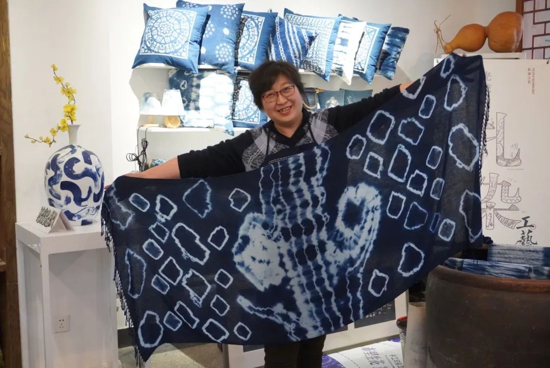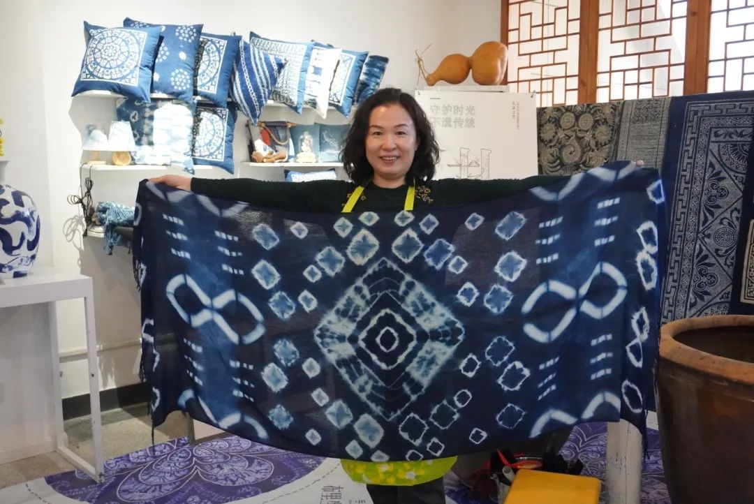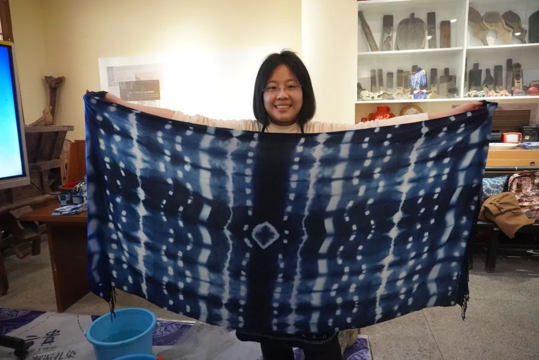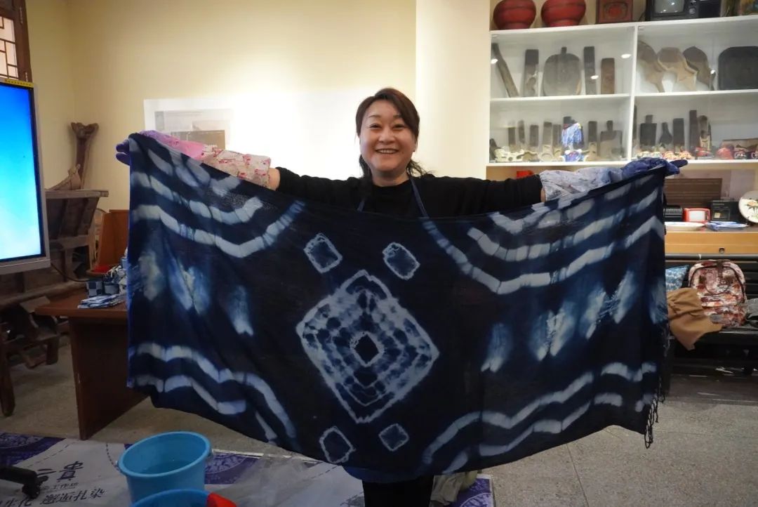 将经过特殊捆扎的白色围巾浸入靛蓝色的染缸内反复浸染氧化,白色围巾上一层层青绿逐渐变为深沉的蓝;最后将捆扎部分解开,蓝白相间、层次分明的图案就出现在了围巾上……在青大民间工艺扎染体验馆,彭老师及其学生用精美的图文和实物演示,从非遗传承故事、原材料种类、制作方法三个方面为老师们讲解了扎染工艺。